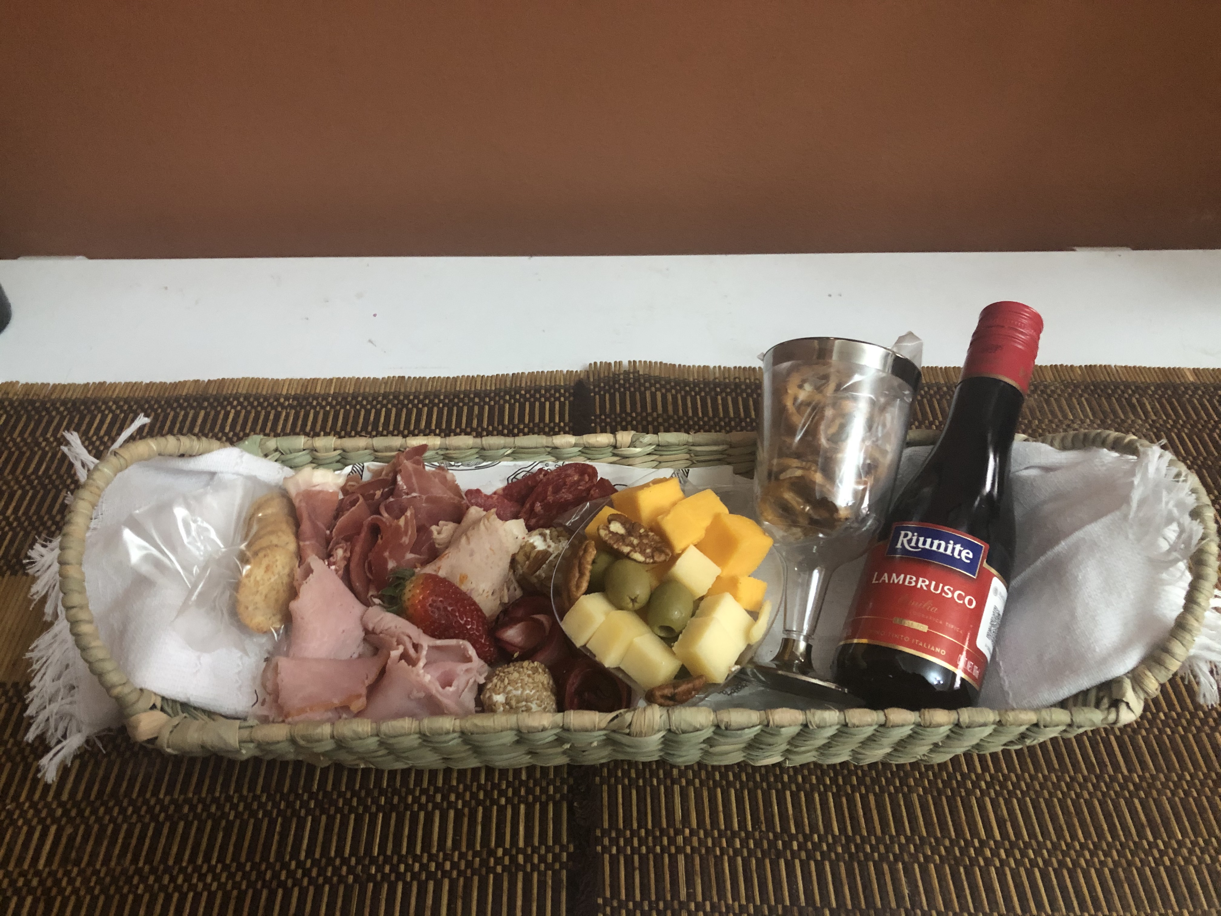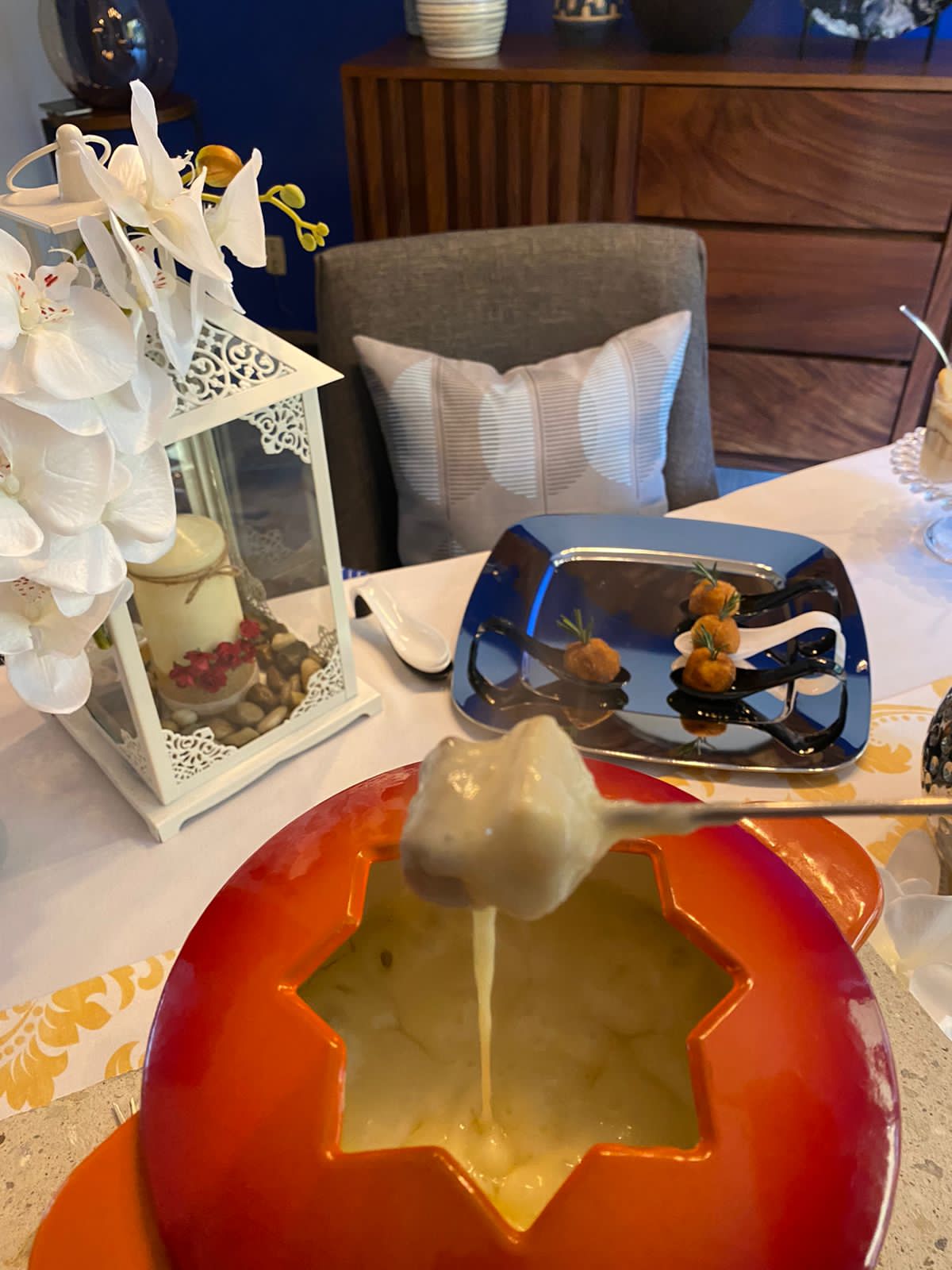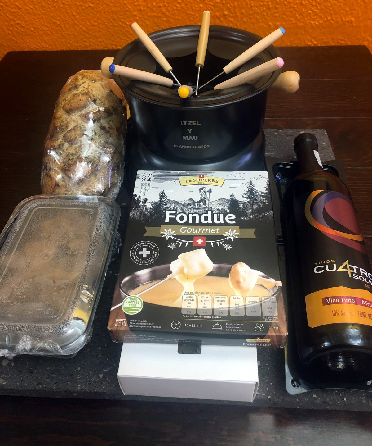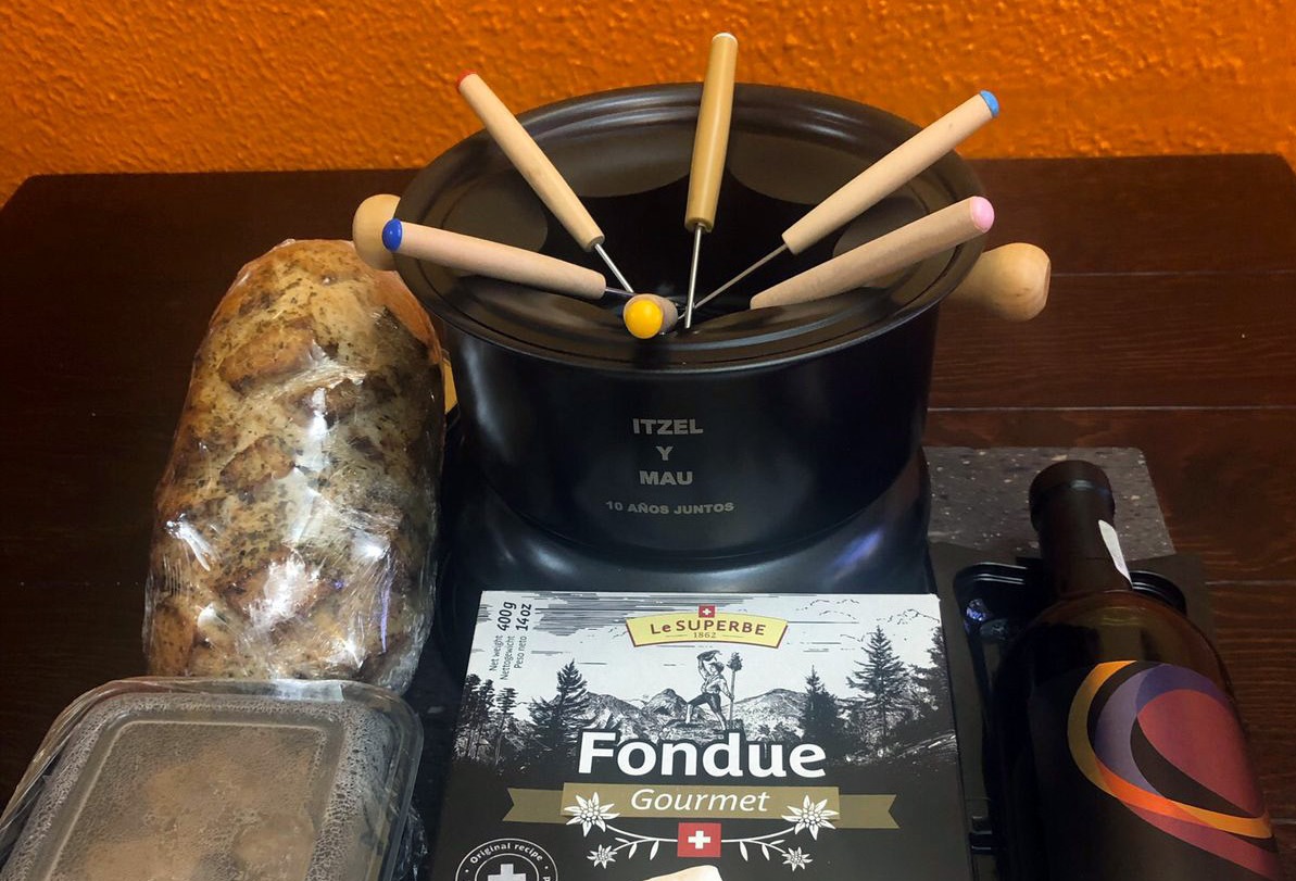Set de fondue, queso, botella de vino, pan artesanal, pan baguette, lata de alcohol y