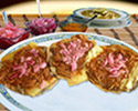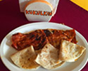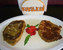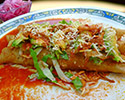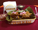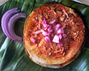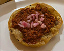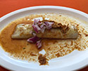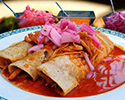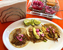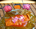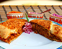 Pan árabe relleno de cochinita pibil o relleno negro con frijoles y queso bañado con salsa pibil.