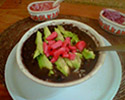 Frijoles enteros con carne de puerco, servidos en una cama de arroz, aguacatae y rábanos.