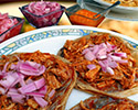 Dos tortillas de harina sincronizada para llevar entre ellas cochinita con un toque de frijoles y queso manchego.